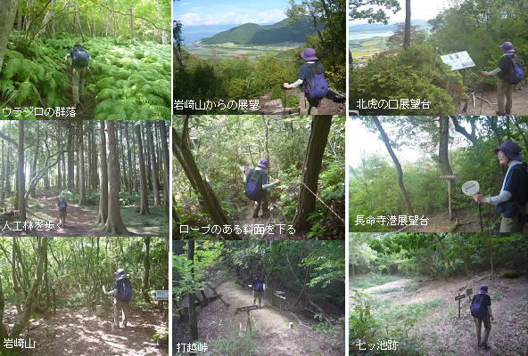 南にある展望広場の木陰で昼食をとった。下りはロープウェイに沿って八幡宮の方向に歩く。ロープウェイ乗り場の手前から登山道が左に下っており、「下山口」の標示がある。木製の鳥居を下り、石畳を歩く。急斜面やウラジロの群落を通過し、再び木の鳥居を潜る。