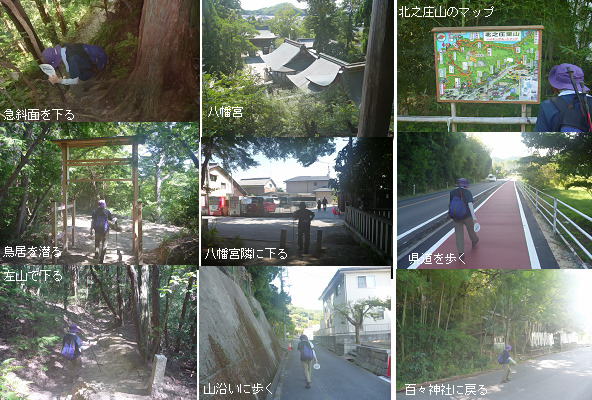 八幡宮を右下に見てすぐに車道に出た。ここから山に沿って住宅街を歩き、北之庄山の登山口を通過。ラコリーナの西側を通って県道26号線の歩道を歩いて百々神社まで戻った。