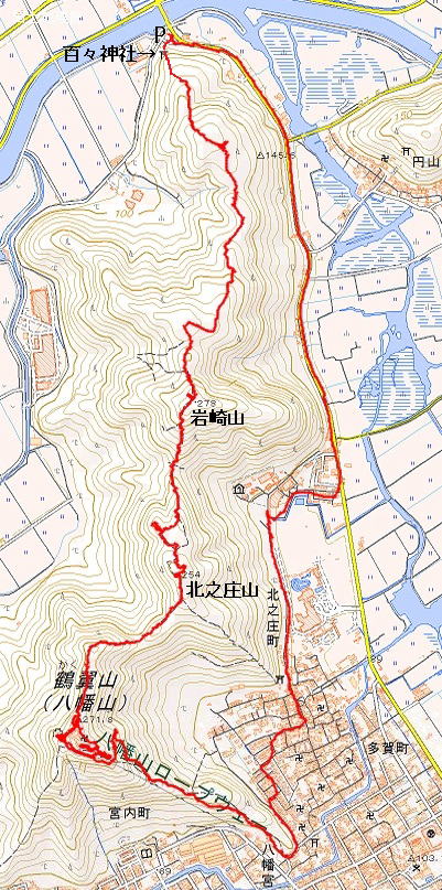 百々神社(9:25)→花回廊(9:42)→岩崎山(10:17)→打越峠(10:36)→北之庄城跡・北之庄山山頂(10:52-11:08)→高取峠(11:18)→八幡山山頂(11:35-13:03)→八幡宮登山口(13:32)→百々神社(14:26)