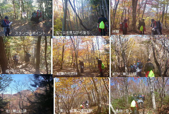 この辺りから美しい天然林の紅葉が見られるようになったので小休止して紅葉の写真を撮る。最高に美しい紅葉に感動。休憩後、なだらかな道を歩き、向きを北に変えて尾根を行く。