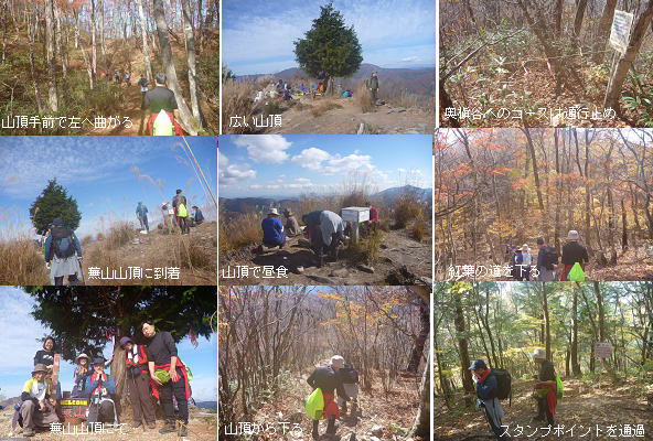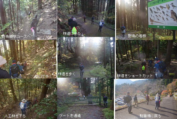 今回は、各自お弁当を持参しての昼食。全員で記念写真を撮って、下山開始。昼食後、登ってきた道を下ってスタンプポイントを通過し、分岐点から野鳥観察コースへ。この道は初めてである。