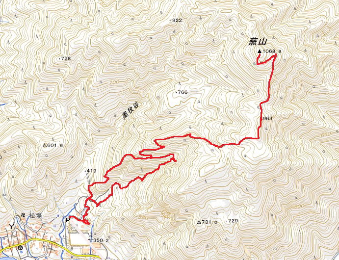 21世紀の森駐車場(8:31)→登山口(8:40)→スタンプポイント(10:15-10:25)→蕪山山頂(11:36-12:41)→スタンプポイント(13:43)→野鳥観察コース分岐(14:02)→林道(14:42)→ゲート(14:45)→駐車場(14:51)
